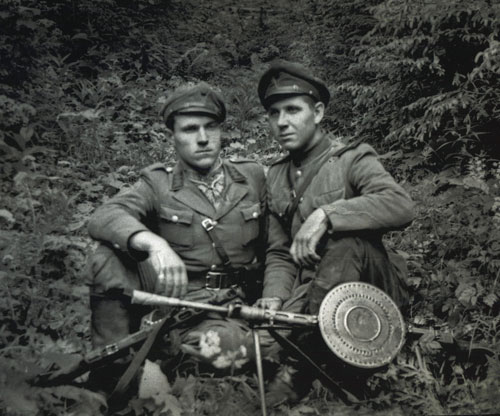 Иван Кулик "Серый" (слева) и Дмитрий Билинчук "Туча": русскоязычный выходец из Донбасса, воевавший в РККА, освобожденный УПА из немецкого плена (по другим данным - бежавший из лагеря военнопленных), вступивший в УПА и ОУН-Б осенью 1943 года и воевавший против советских оккупантов в течении восьми лет до последнего дня своей жизни, героически погибнув в бою осенью 1951 года - стоит рядом со своим другом и соратником, украиноязычным выходцем из Галичины. Два украинца, выросшие в разных государствах, в условиях разных политических систем - встретились в одном повстанческом отряде, чтобы вместе бороться за независимую соборную Украину. Очень символичное фото.